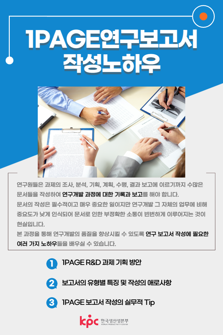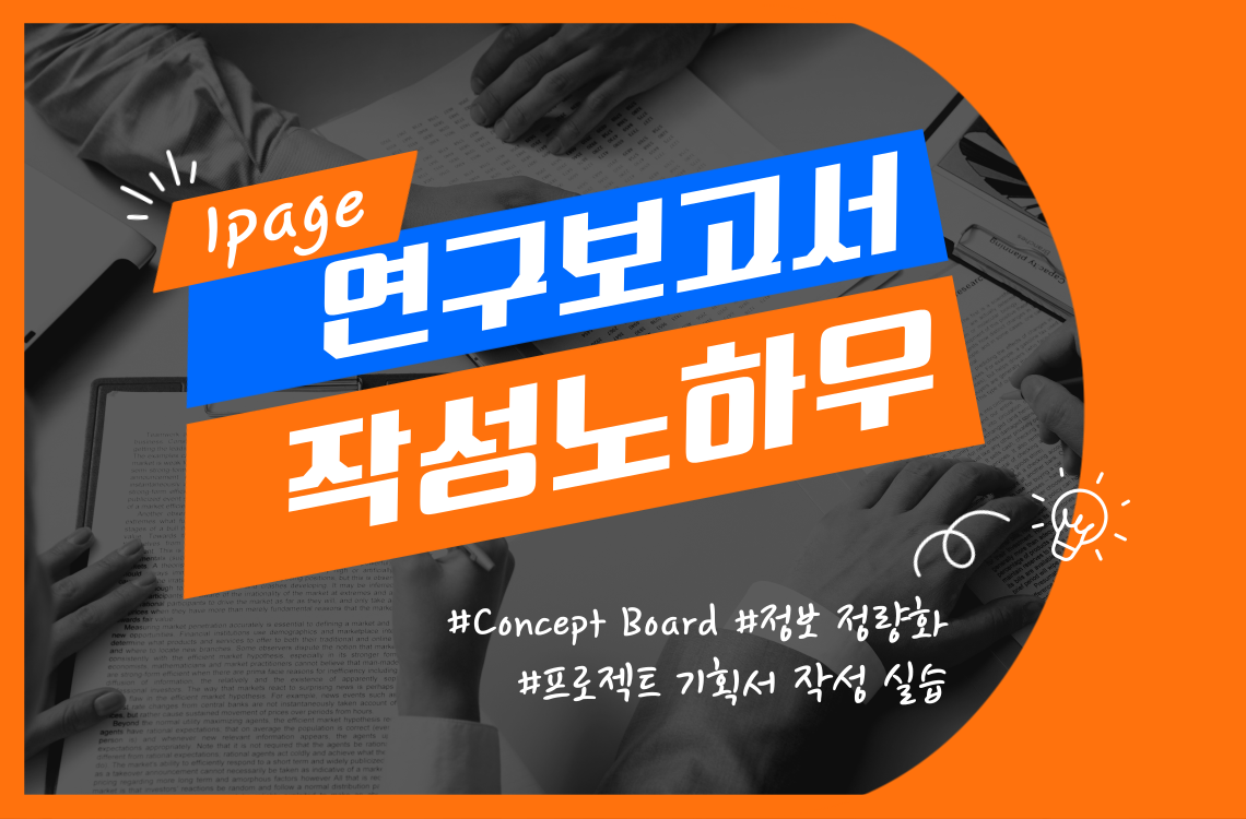 오후 | ㅇ 보고서 작성 실무 노하우 1) 프로젝트 정의(Define), 프로젝트 기획서 양식 작성법 2) 1PAGE 아이템 기획 : Concept Board를 통한 아이템 기획 - 정보 분석 및 문서작성 실무 1) 정보 수집 및 분석과 시각화 방법 : 구조화된 문서 작성, 도표로 말하는 법 2) 정량화 & 수치화 : 숫자로 말하기 3) 목적에 따른 데이터 정리 Tip - [실습] 1PAGE 연구보고서 작성 Tip & 실습 : 실험 보고서, Concept Board, NABC 기획서, 프로젝트 기획서 등 | |
